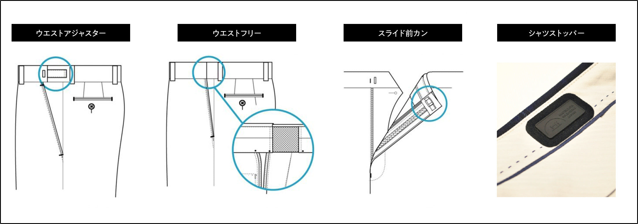 太ったり痩せたり、体型の変化に対応する「ウエストアジャスター」。デスクワークやアクティブな動きなど、スライドゴムがお腹に同調し伸びの良い「ウエストフリー」。