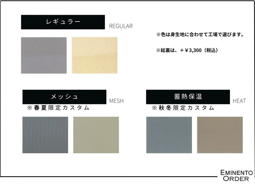※コットンやポリエステルなど、ウォッシャブル生地の場合は、水洗い後の乾きが悪いので「ライニングなし」をおすすめしております。メッシュであれば、多少乾きは良いです。
