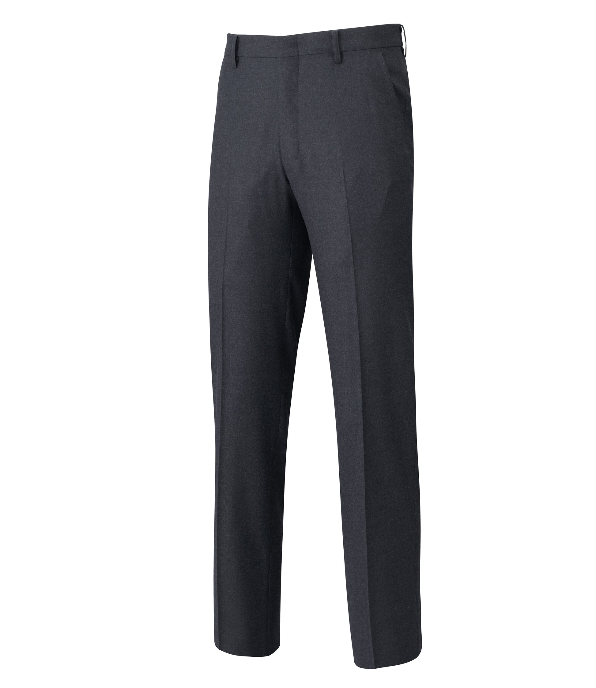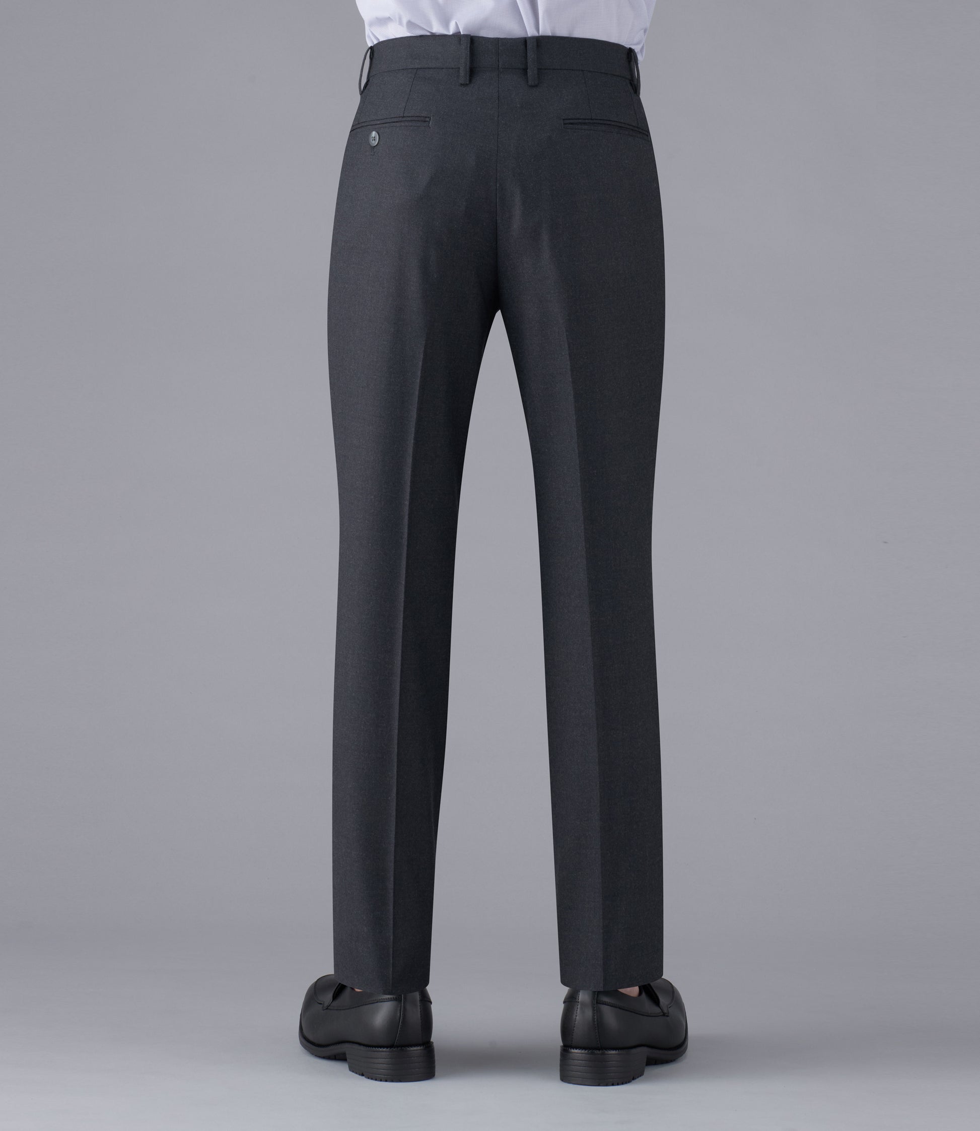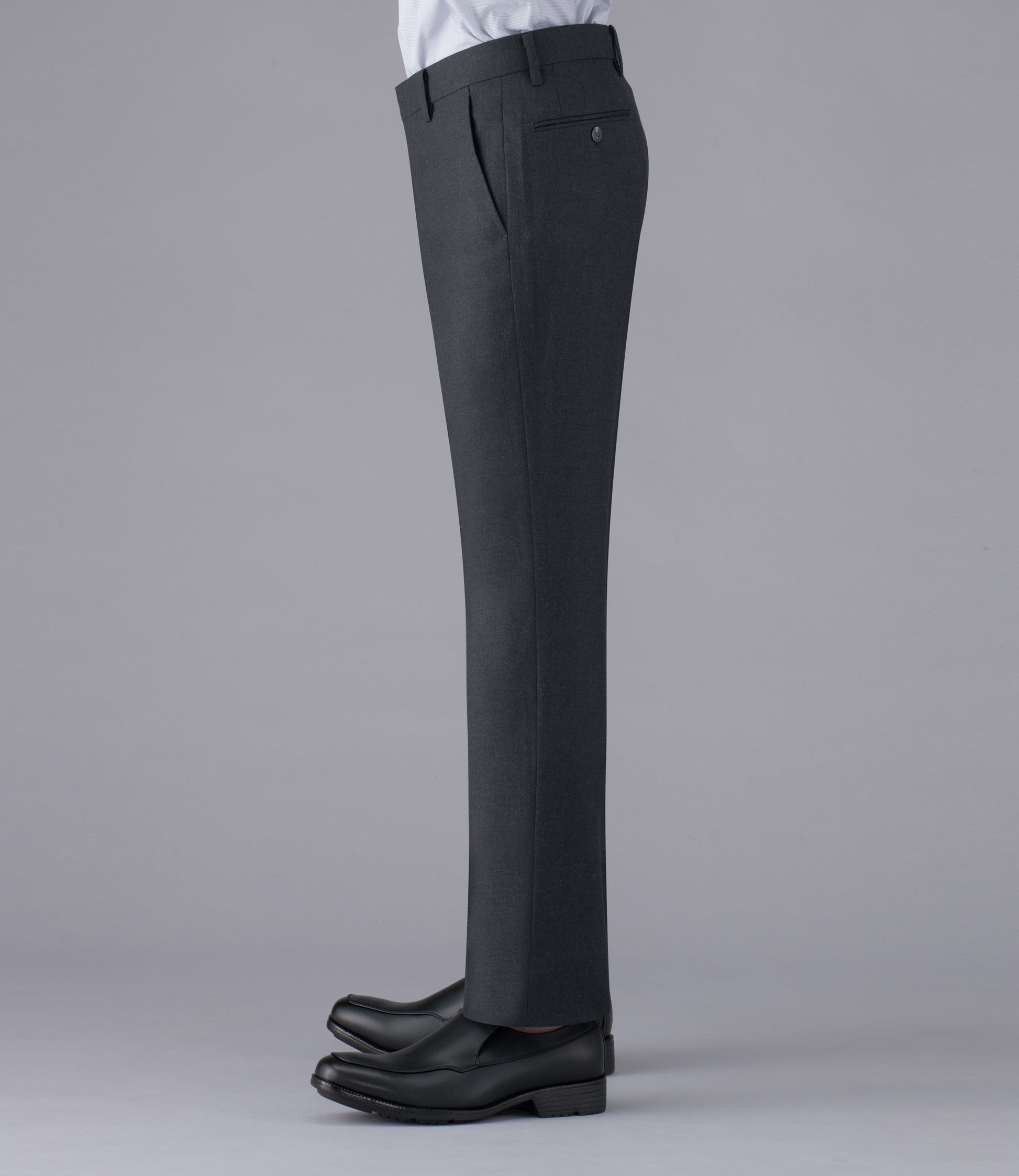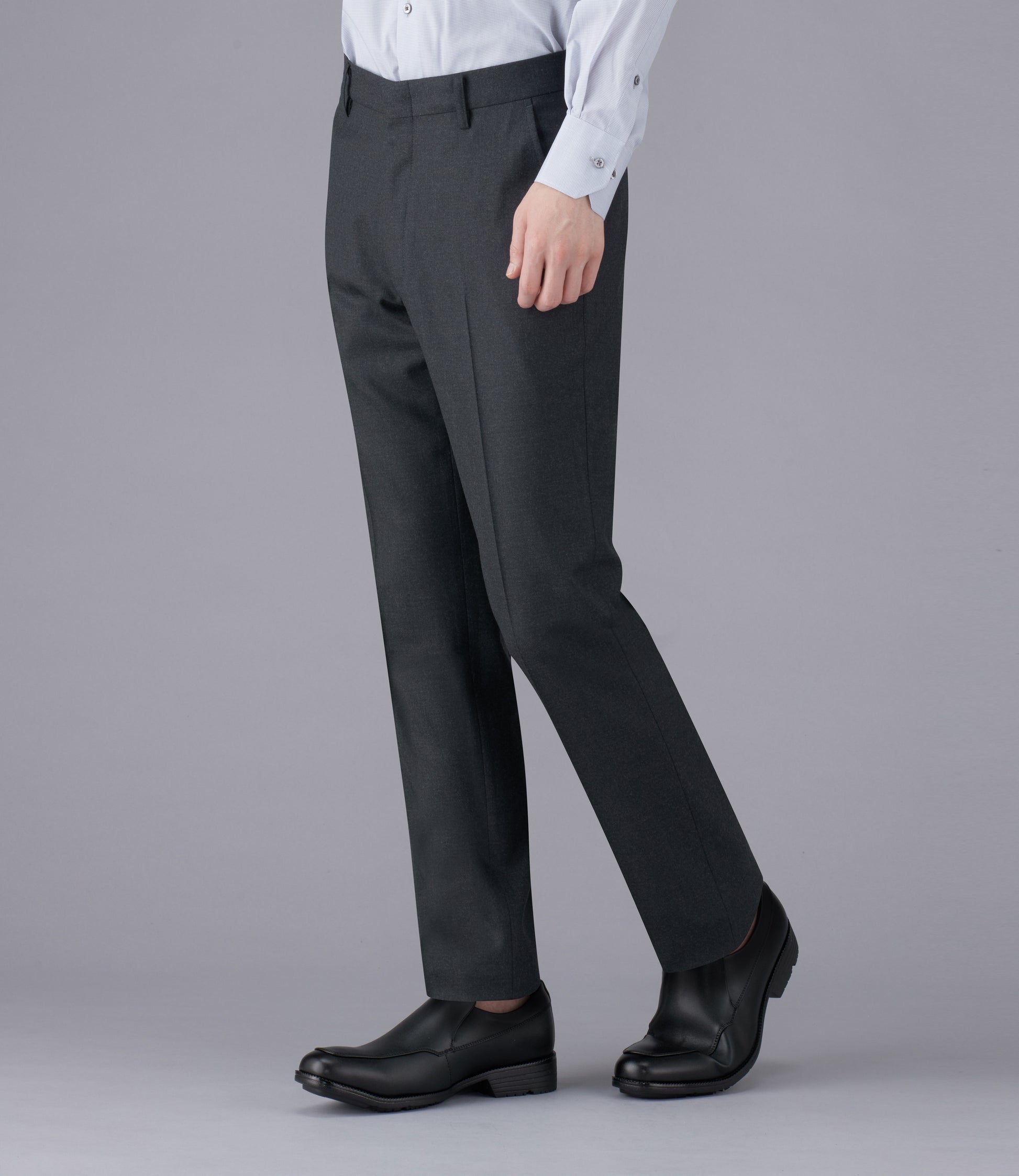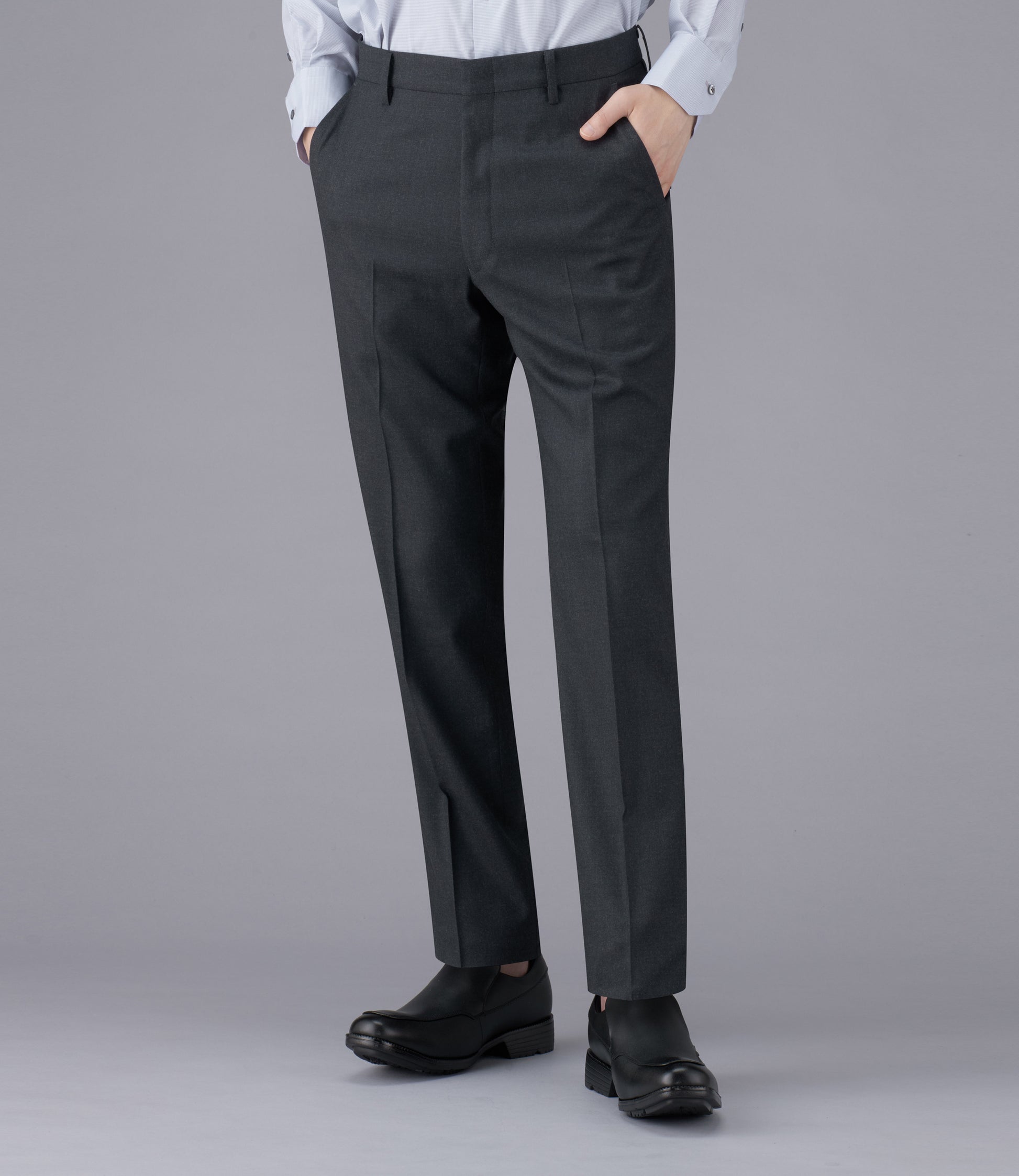 タスマニアウール混紡のソフトな肌触りが特長です。何にでも合わせやすいチャコールグレーで、ジャケット、セーターコーディネートに最適な1本です。