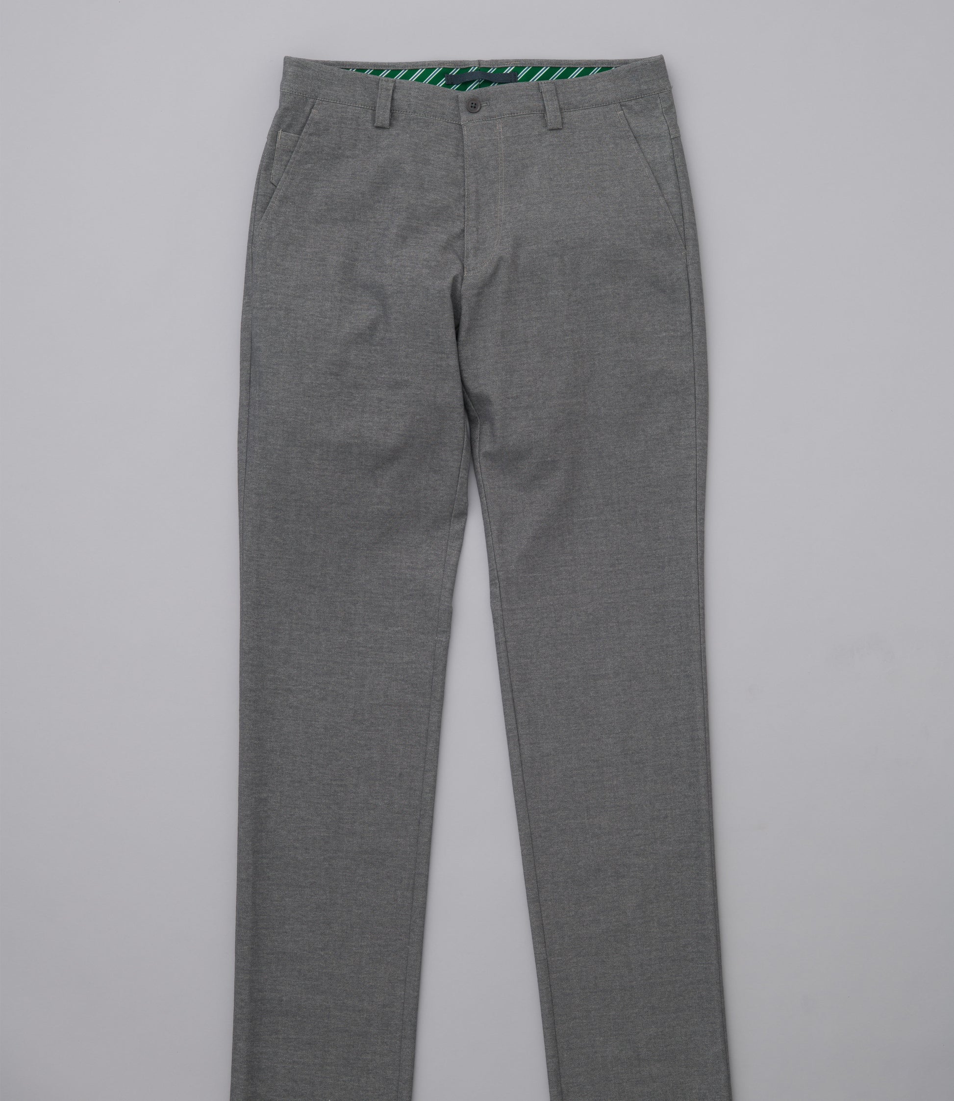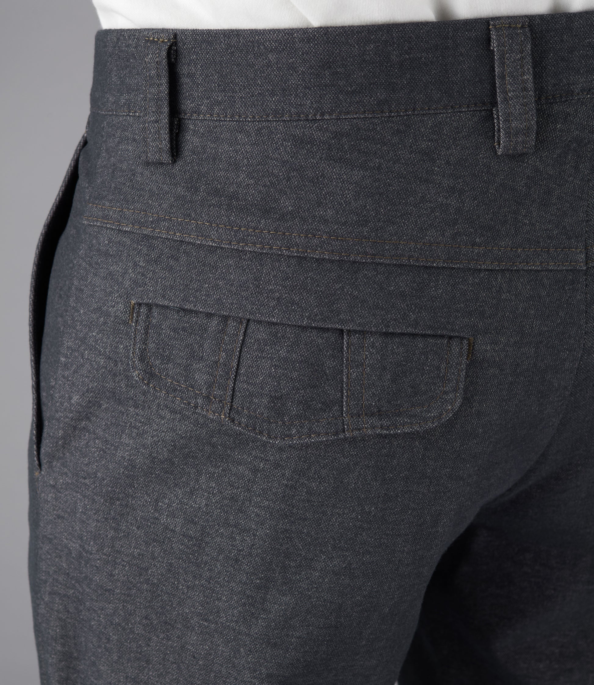 コットンとポリエステルの糸を使用しデニムの様な見え方を表現しました。インディゴ染料を使っていないので色落ちもし難く、洗いを繰り返しても綺麗な状態を維持します。シワにもなりにくくイージーケアに優れた商品です。