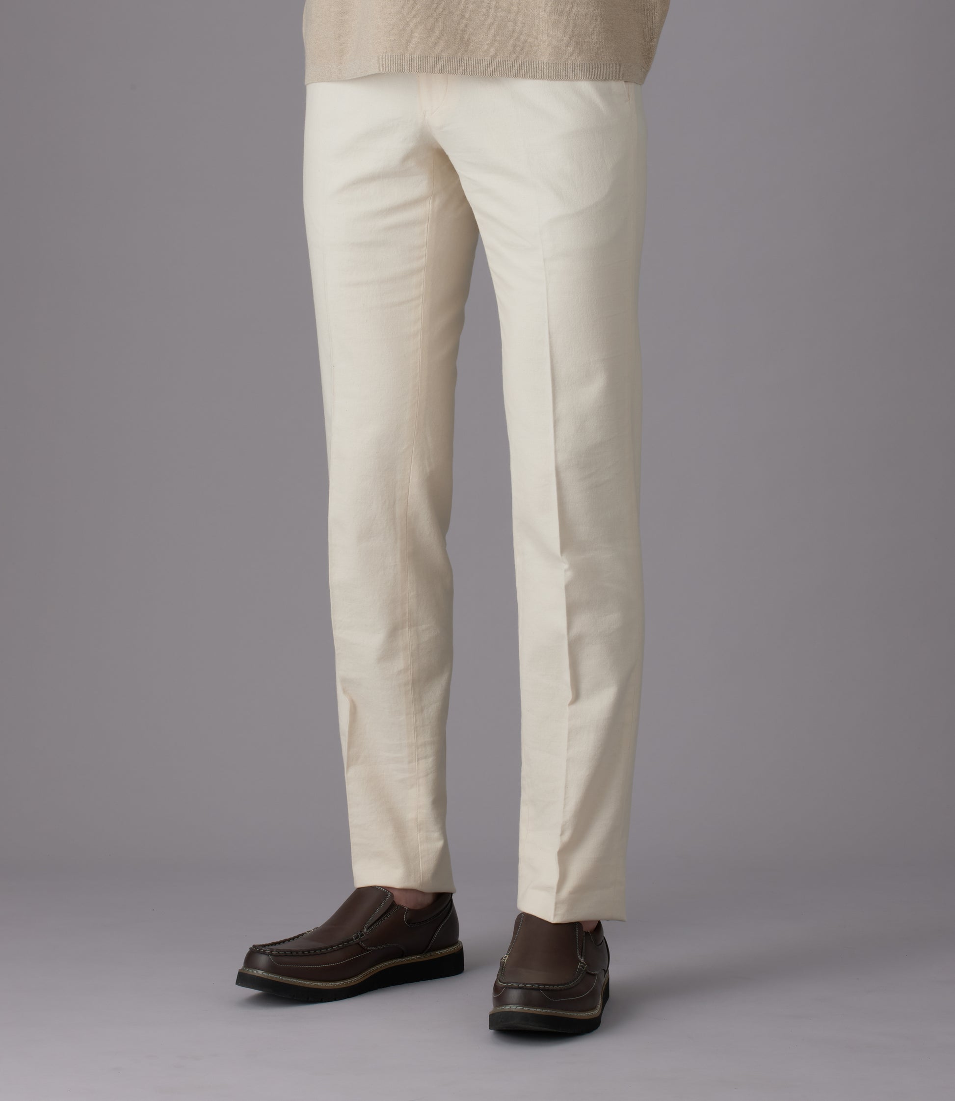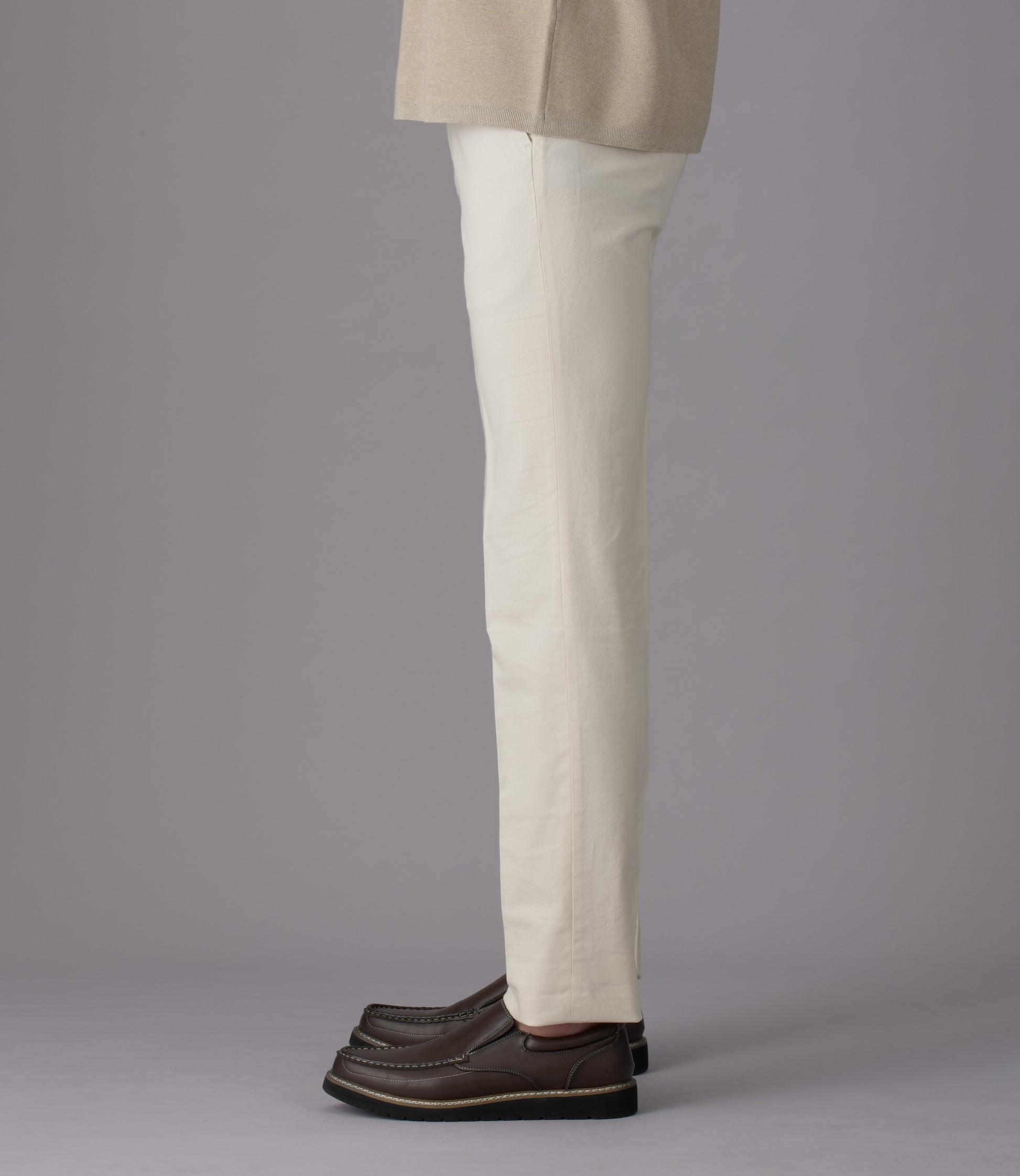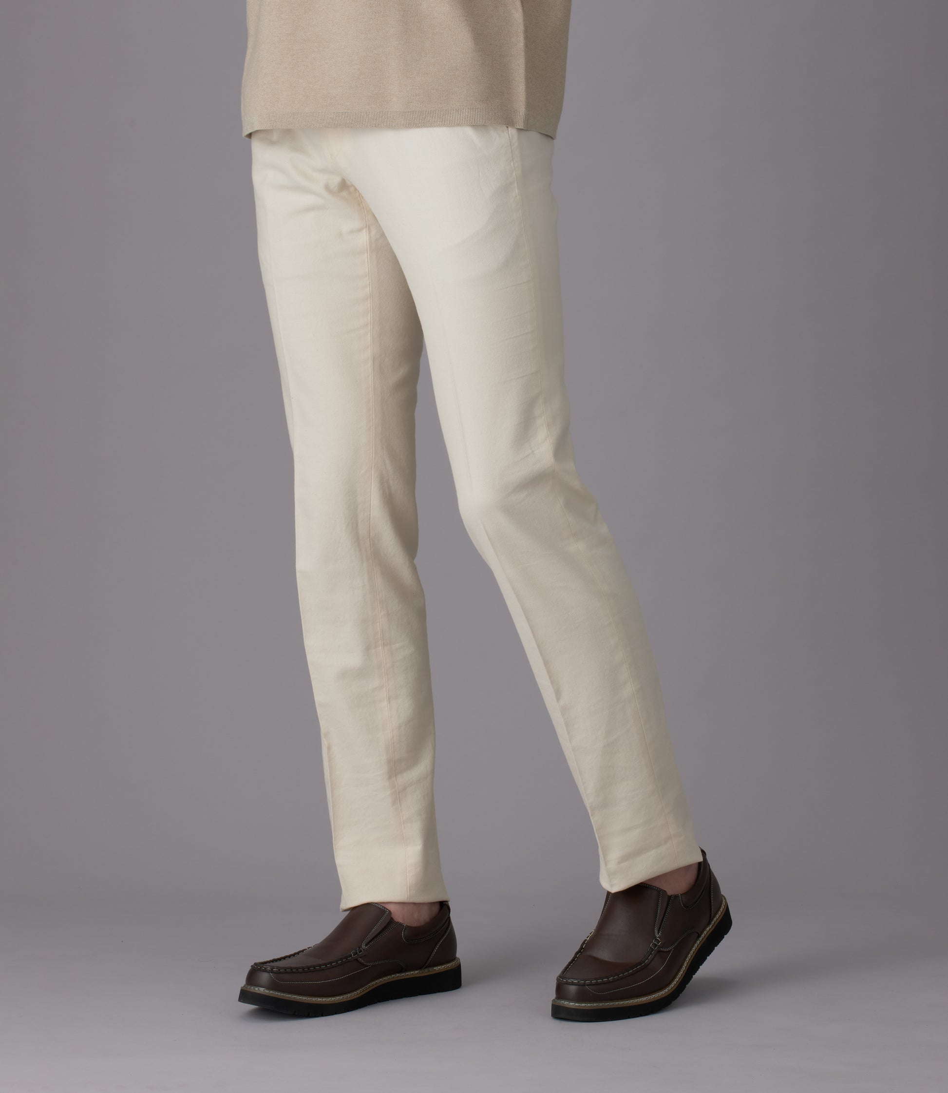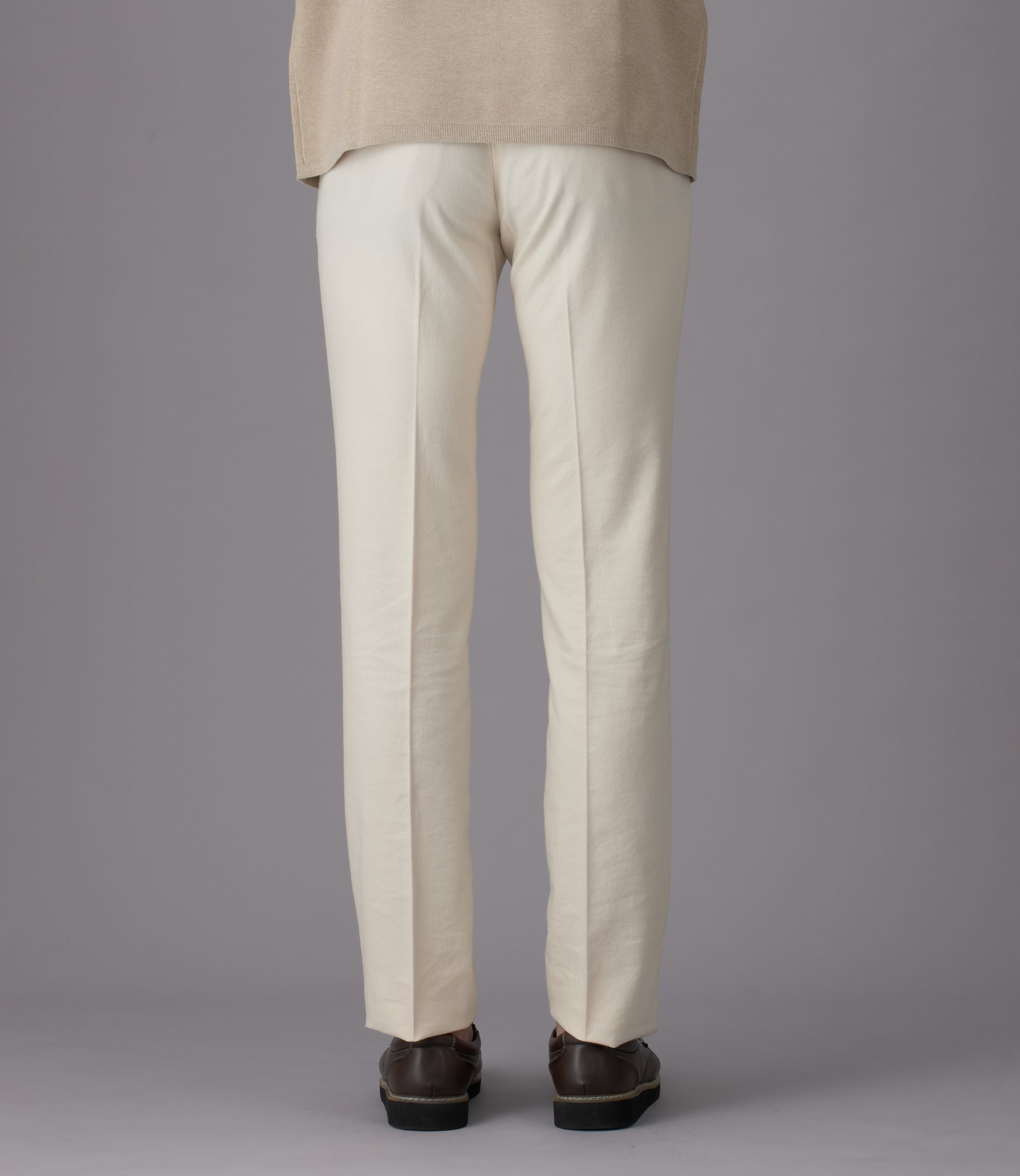 洋服にとって一番仕立て映えするのはウール素材と言われています。そのウールとコットンを混紡することでそれぞれの特徴を備えた商品に仕上がっています。コットン100%にはない適度なドレープ性があるのでシルエットが大変綺麗に出ます。また肌触りがとっても滑らかで足通りも良く、気持ち良く着用して頂けます。是非一度お試し下さいませ。